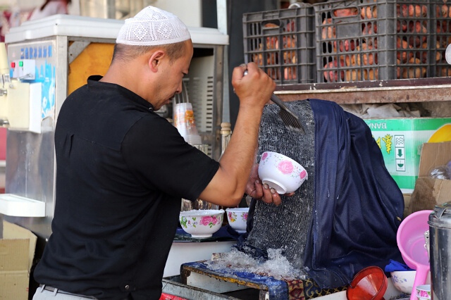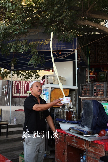 在喀什市中心老城区大清真寺门前,有一个卖酸奶的维吾尔人,他有一手绝活,能够制作可口的酸奶冰(沙让多克),喝他的酸奶,不仅仅是喝一碗酸奶而已,更是欣赏他的表演。