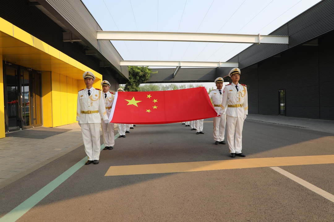 鲜艳的五星红旗伴随着雄伟、嘹亮的《中华人民共和国国歌》、及全体人员的注目礼下,冉冉升起,迎风飘扬。